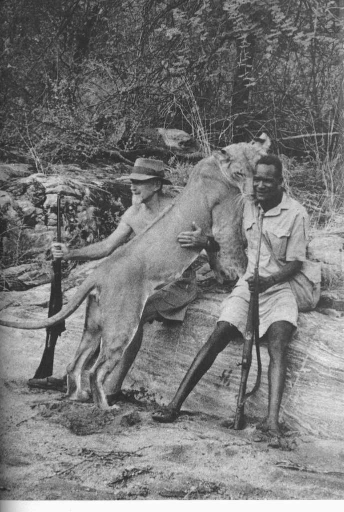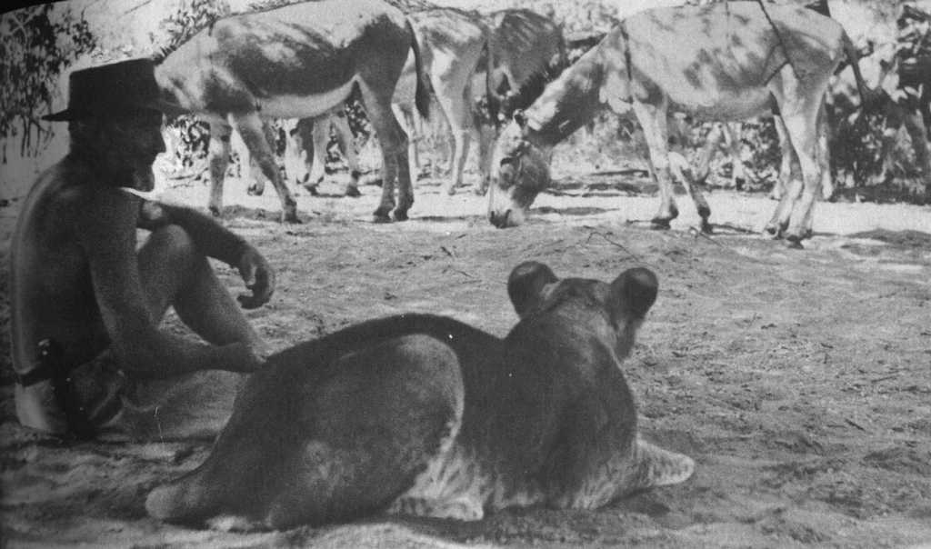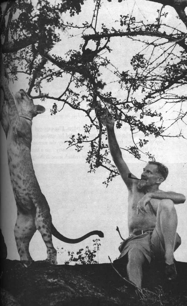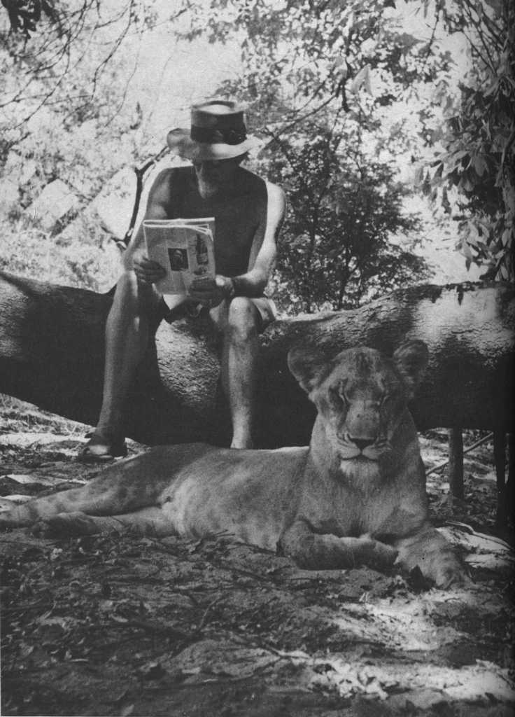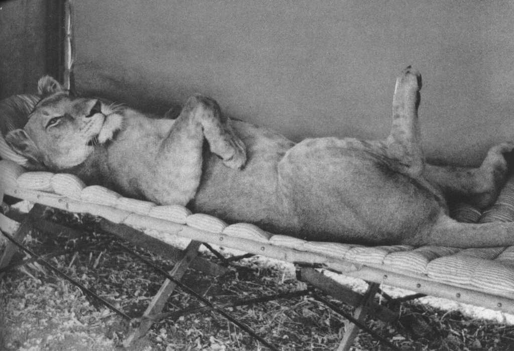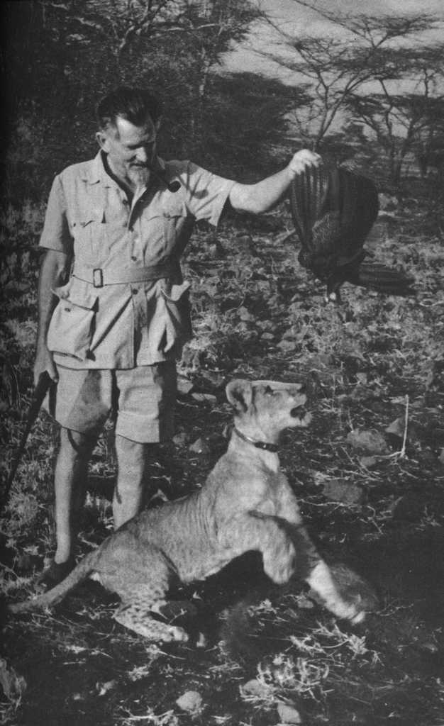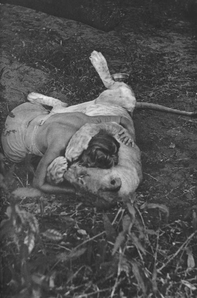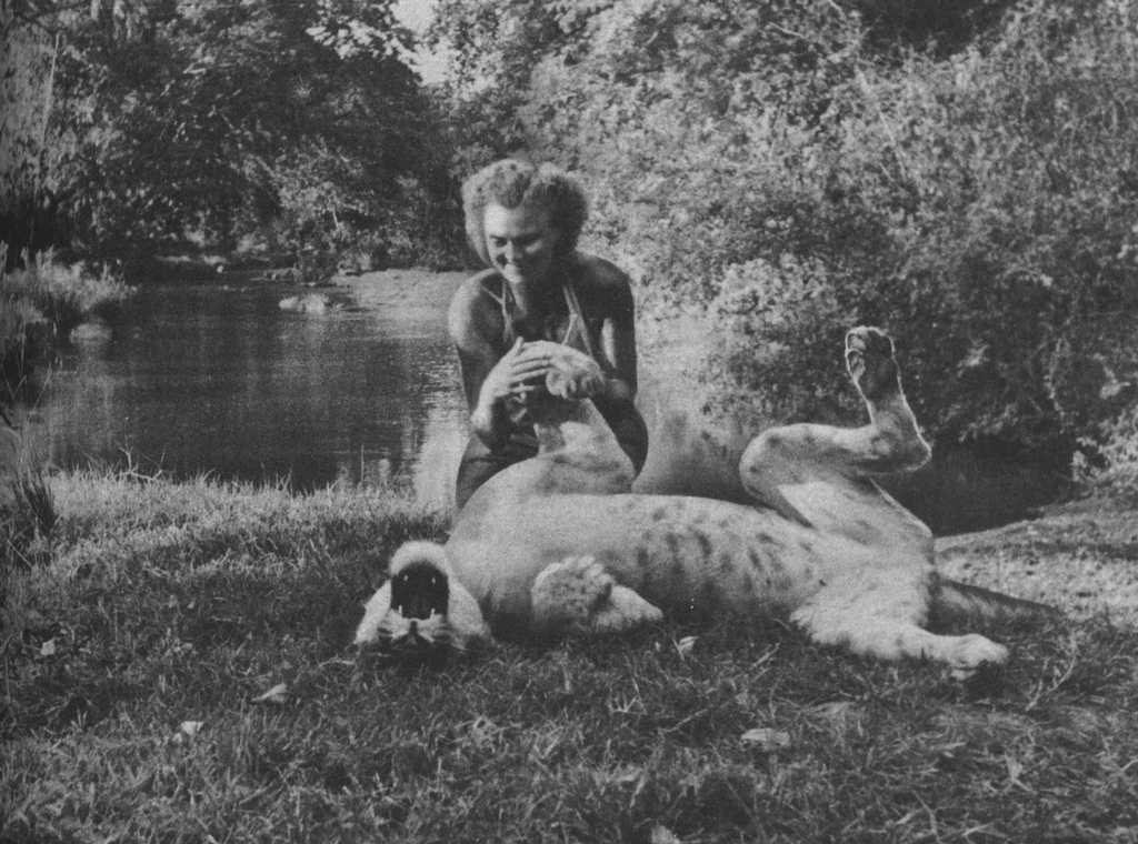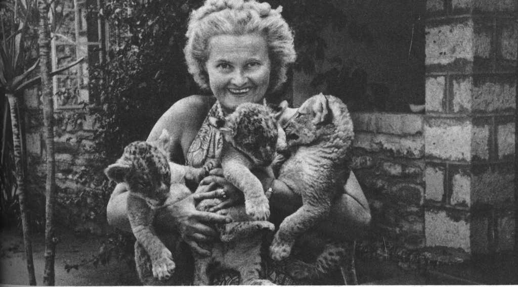 Joy Adamson and the three female cubs (seven weeks old): The 'Big One', Lustica and Elsa |